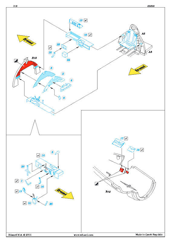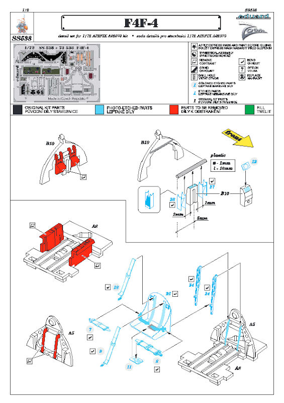 Für die Aifix Grumman F4F-4 Wildcat in 1/72 hat eduard ein ZOOM-Fotoätzteilset herausgebracht. Dieses kann man durchaus auch für die britische Martlet Mk. IV nutzen. Es enthält eine kleine mehrfarbig bedruckte Platine und die übersichtliche Bauanleitung. Eduard hat an die obligatorischen mehrfarbigen Sitzgurte, Details für einen neuen Sitz und an die wundervollen Instrumente gedacht. Weiterhin gibt es weitere Details fürs Cockpit. Es gibt weiterhin ein paar Hebelchen und eine Kartentasche für die Grumman.