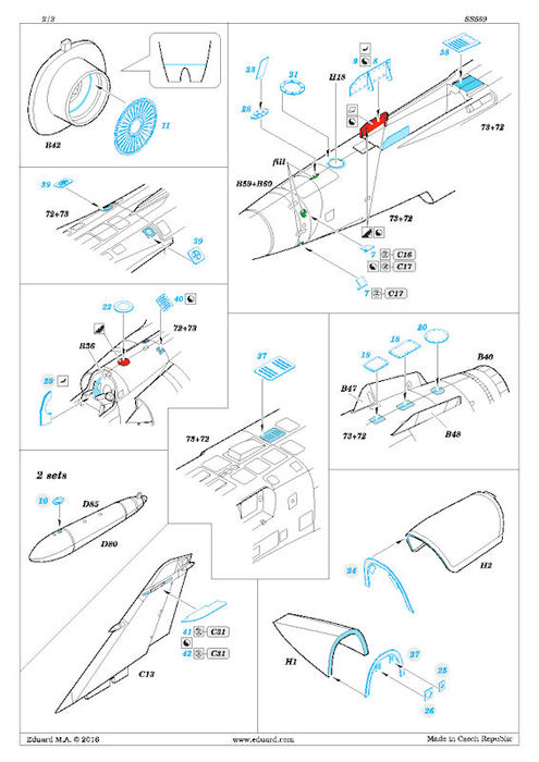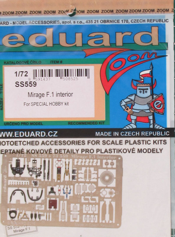 Für den gelungenen Bausatz der Dassault Mirage F. 1 von special hobby im Maßstab 1/72 hat eduard ein Fotoätzteilset für das Innere des Bausatzes herausgebracht. Es enthält eine kleine mehrfarbig bedruckte Platine, einen kleinen Fotofilm und die Bauanleitung. Eduard liefert hier wunderschöne Details für das Innere aber auch Äußere des Bausatzes. So gibt es ein neues Instrumentenbrett, neue Seitenkonsolen, ein Visier, vor allem aber Details und Gurte für den Schleudersitz. Weiterhin gibt weitere Kleinteile für das Äußere. Das sind u.a. Bugfahrwerksklappen, Teile fürs Triebwerk und die Kanzel.