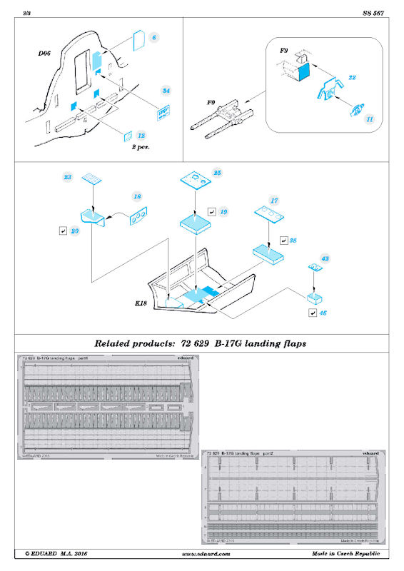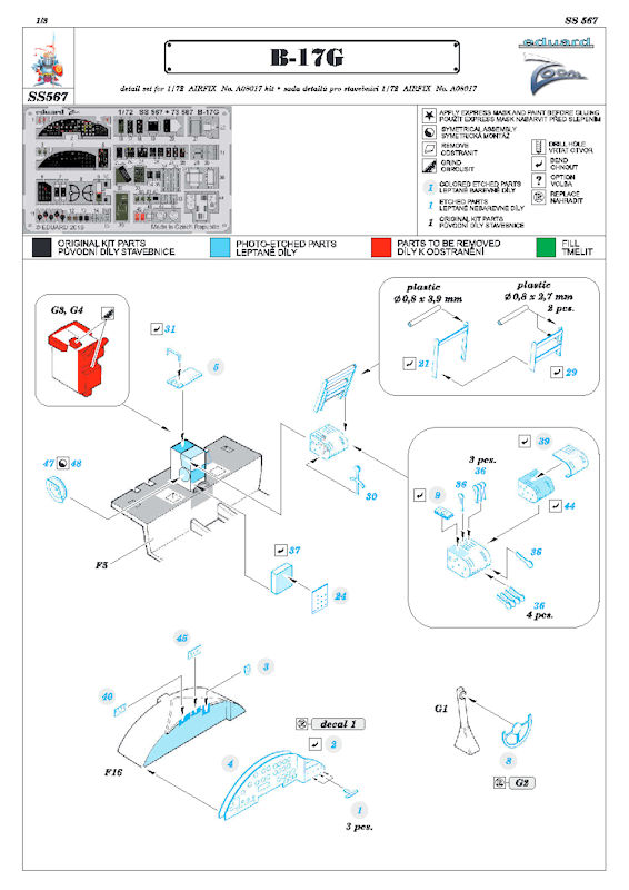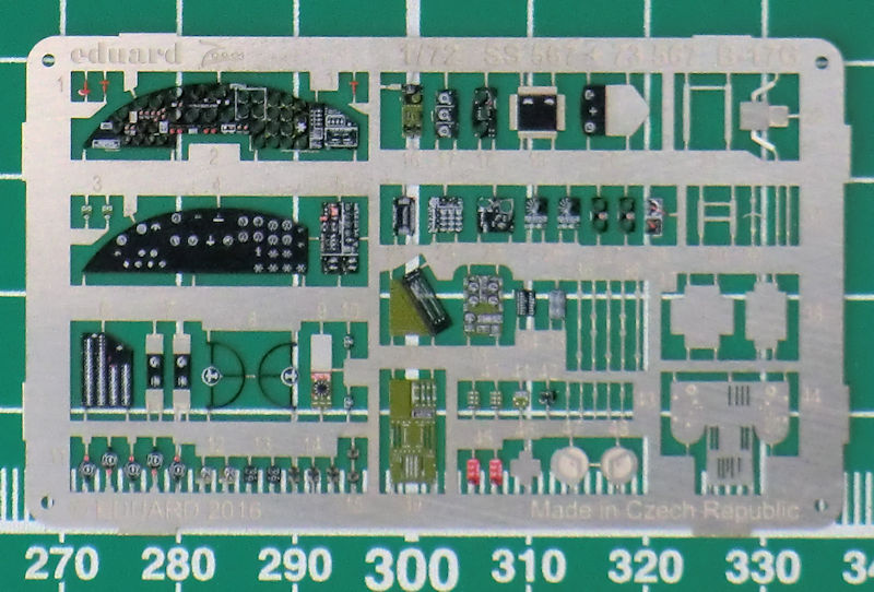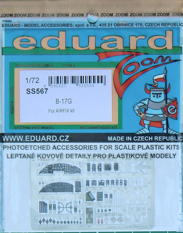 Für den neuen Bausatz der Boeing B-17G von Airfix in 1/72 hat eduard ein ZOOM-Fotoätzteilset für den Bausatz herausgebracht. Es enthält ein kleine mehrfarbig bedruckte Platine und die übersichtliche Bauanleitung. Eduard hat an die an die wundervollen Instrumente fürs Cockpit gedacht. Weiterhin gibt es weitere Details(z.B. Hebel und Geräte) fürs Cockpit.