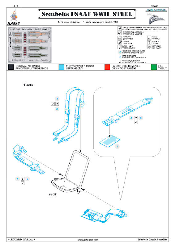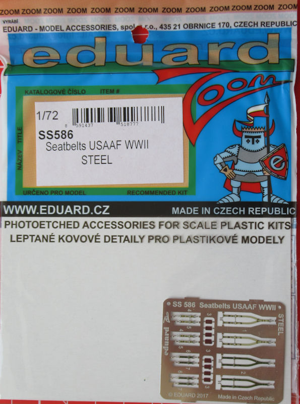Für die verschiedenen Flugzeug-Bausätze der USAAF aus dem WK II in 1/72 bietet eduard hier ein Fotoätzteilset mit Sitzgurten an. Es enthält eine kleine mehrfarbig bedruckte Platine und die übersichtliche Bauanleitung. Eduard liefert hier wunderschöne bedruckte mehrfarbige Sitzgurte für die verschiedensten US Army-Flugzeuge.