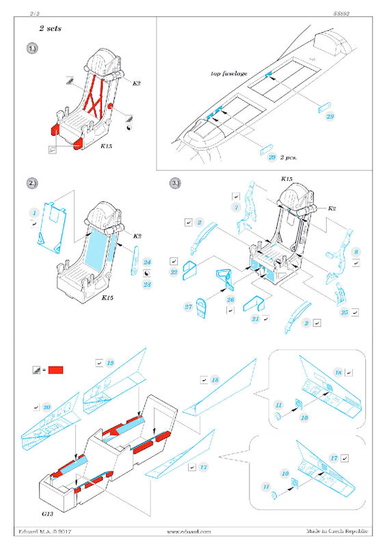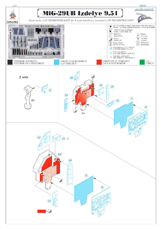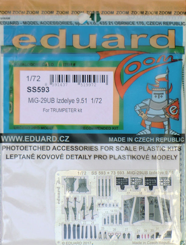 Für die MiG-29UB Izdelye 9-51 von TRUMPETER hat eduard u.a. ein ZOOM-Set herausgebracht. Es enthält ein kleine mehrfarbig bedruckte Platine und die Bauanleitung. Eduard liefert hier wunderschöne Details für das Cockpit des Bausatzes. So gibt es u.a. neue mehrfarbig bedruckte Instrumentenbretter, neue Seitenkonsolen, Sitzgurte für die Schleudersitze und viele Kleinteile.