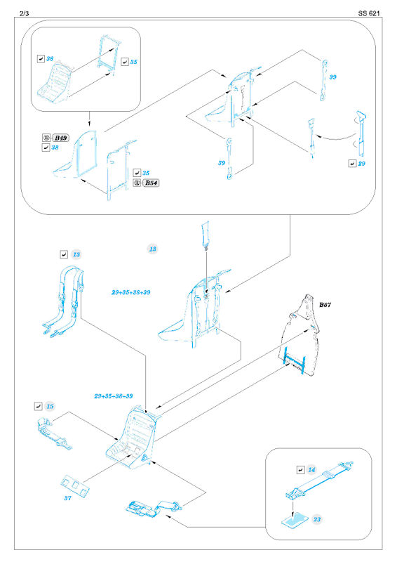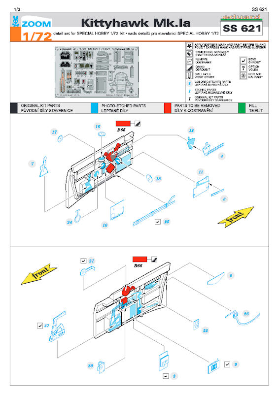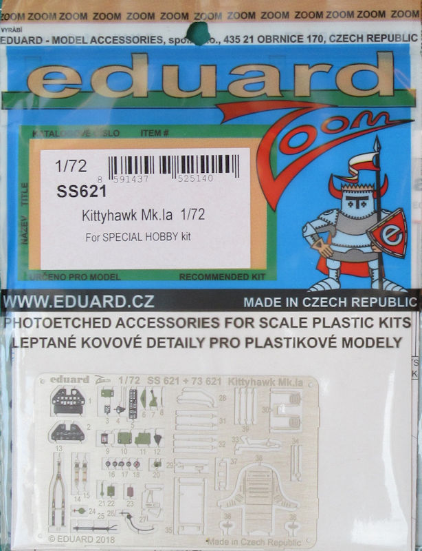 Für den gelungenen Bausatz der Curtiss Kittyhawk Mk. Ia von special hobby hat eduard einige Fotoätzteilsets herausgebracht. Dieses ZOOM-Set enthält ein kleine vernickelte Platine und die Bauanleitung. Eduard liefert hier die nötigsten Details für das Innere des Bausatzes. So gibt es einen neuen Sitz mit passenden Gurten, Seitenruderpedale, weiterhin weitere Kleinteile fürs Cockpit. Selbst an den innenliegenden Rückspiegel hat man gedacht.