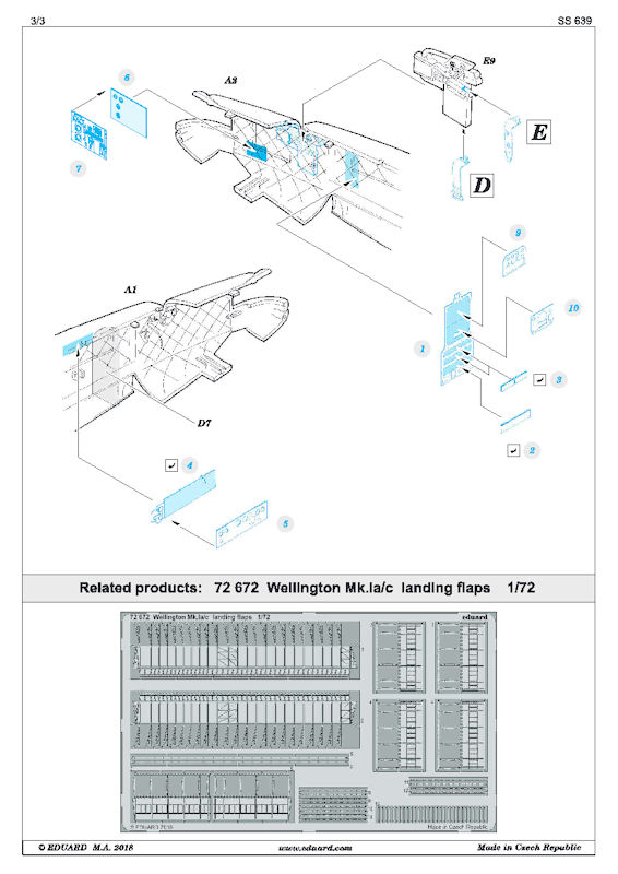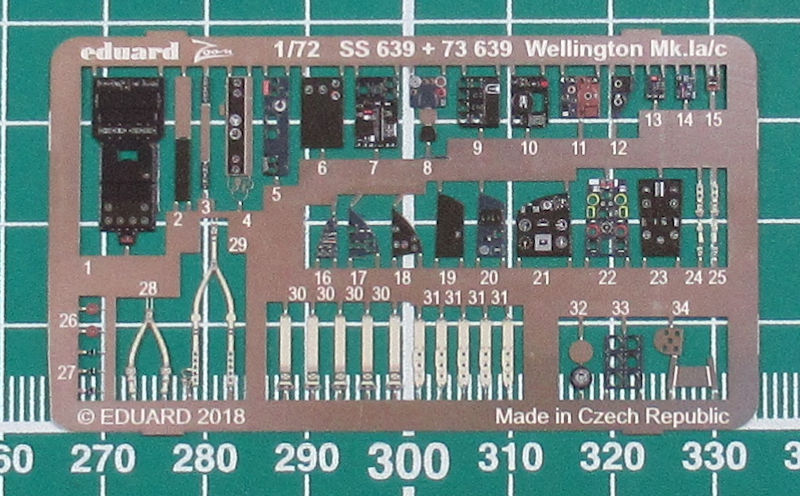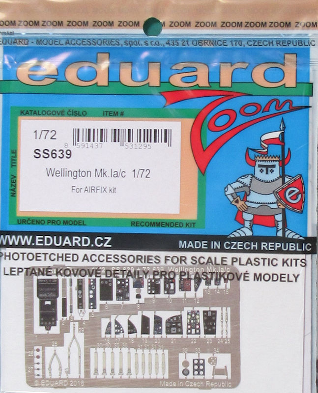 Für den gelungenen Bausatz der Vickers Wellington Mk. Ia/c von Airfix hat eduard ein ZOOM-Fotoätzteilset herausgebracht. Es enthält eine kleine mehrfarbig bedruckte Platine und die Bauanleitung. Eduard liefert hier wunderschöne Details für das Innere des Bausatzes. So gibt es vor allem neue Instrumente und Sitzgurte sowie ein paar Hebel.