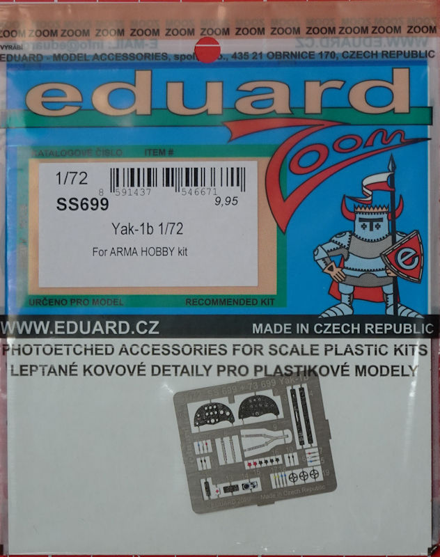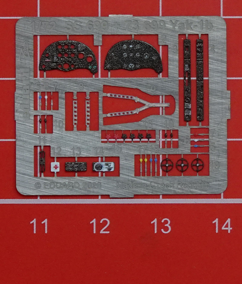 Für die verschiedenen Bausätze der Jakowlew Jak-1b von Arma Hobby in 1/72 hat eduard ein ZOOM-Fotoätzteilset herausgebracht. Es enthält eine kleine mehrfarbig bedruckte Platine und die Bauanleitung. Eduard liefert hier wunderschöne Details für das Innere des Bausatzes. So gibt es ein neues mehrfarbig bedrucktes Instrumentenbrett, farbige Geräte, Sitzgurte und paar weitere Kleinteile.