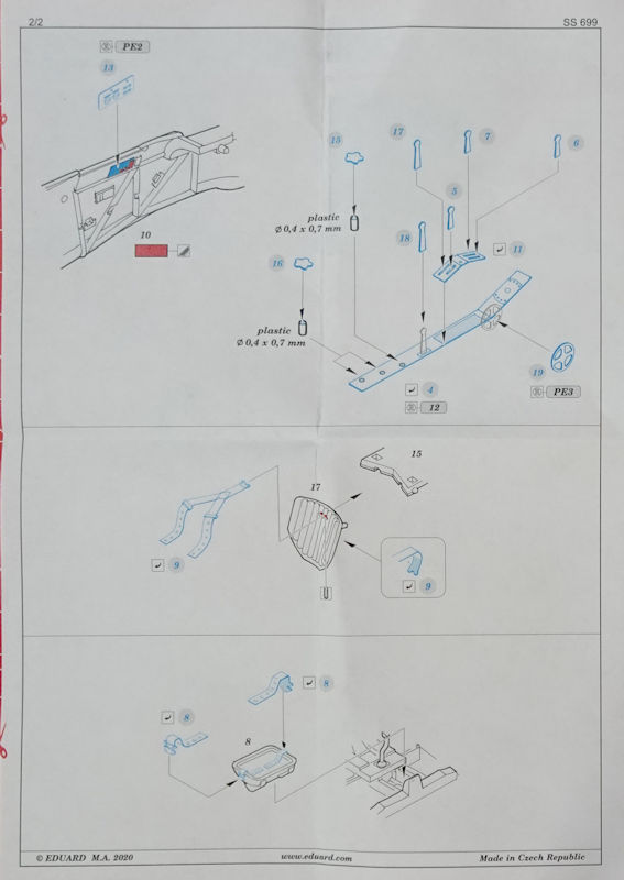 Alle Teile sind für das Cockpit der kleinen Jak-1b. Die Bauanleitung zeigt auf zwei Seiten wie alles gemacht wird. Insgesamt sehen die mehrfarbig bedruckten Teile deutlich besser aus als die zu bemalenden einfachen von Arma Hobby.