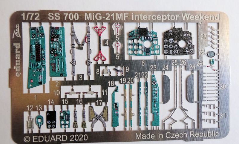 Zeitgleich zu seinen WEEKEND editionen bringt eduard die passenden Aufwertungsoptionen heraus. Dazu gehört die Platine für das Cockpit. Sie enthält die Instrumentenbretter, passende Teile für den Schleudersitz und einiges für das Hauptfahrwerk.