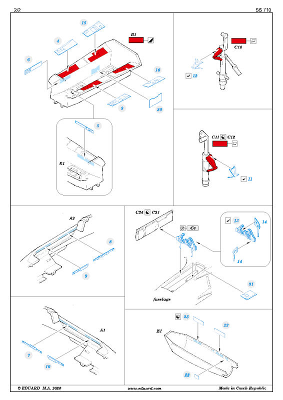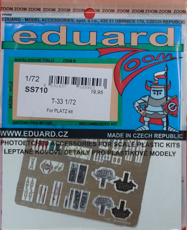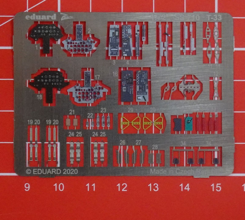 Für die Lockheed T-33 Shooting Star von PLATZ hat eduard ein ZOOM-Fotoätzteilset herausgebracht. Es enthält eine kleine mehrfarbig bedruckte Platine und die Bauanleitung. Eduard liefert hier wunderschöne Details für das Innere des Bausatzes. So gibt es zwei neue mehrfarbig bedruckte Instrumentenbretter, farbige Geräte, Sitzgurte und paar weitere Kleinteile.