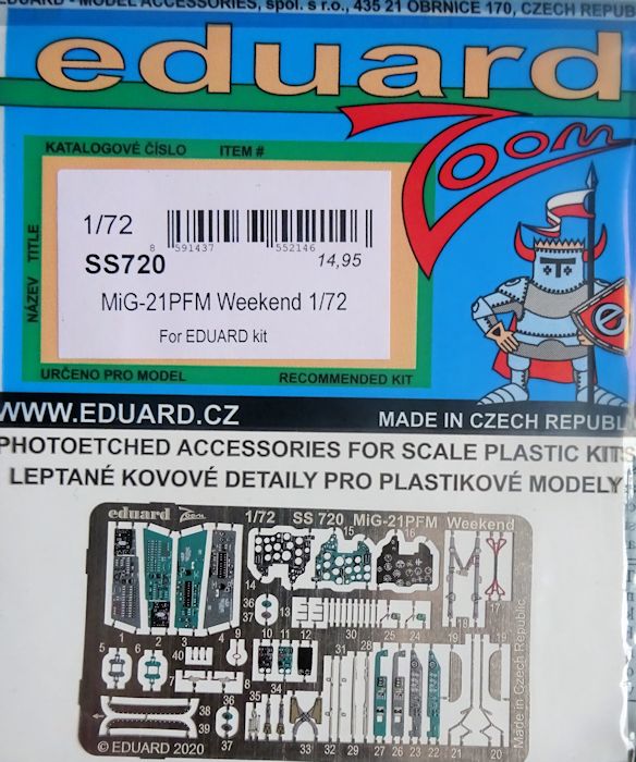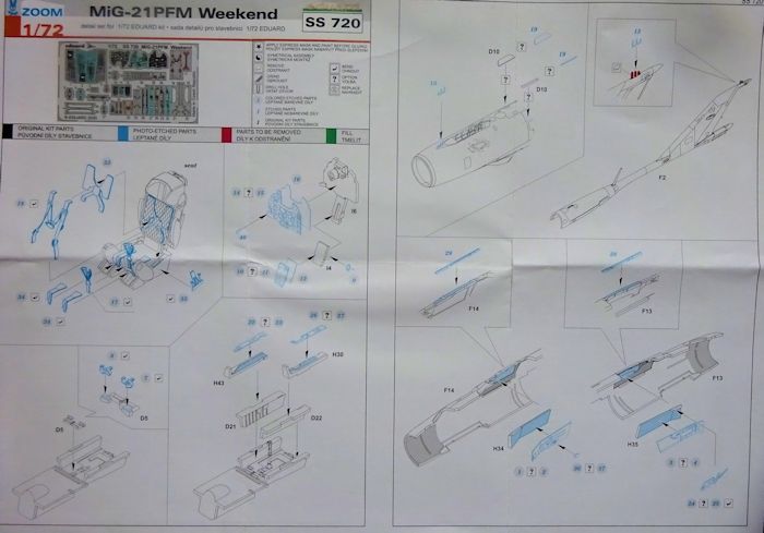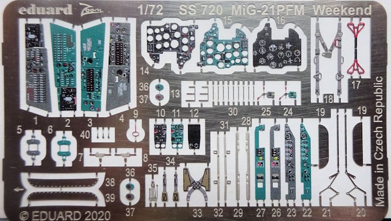 Passend zur MiG-21PFM Weekend Edition erscheint ein Detailset. Der Satz enthält einen Bogen mit farbigen Fotoätzteilen. Dieser bietet Material für eine etwas erweiterte Ausgestaltung im Instrumentenbereich. Bei der Farbauswahl ist man auf eigene Recherchen angewiesen. Die Gurte ersetzen die Decals des Weekendbausatzes. Auch für das Hauptfahrwerk und ist etwas auf dem Bogen.