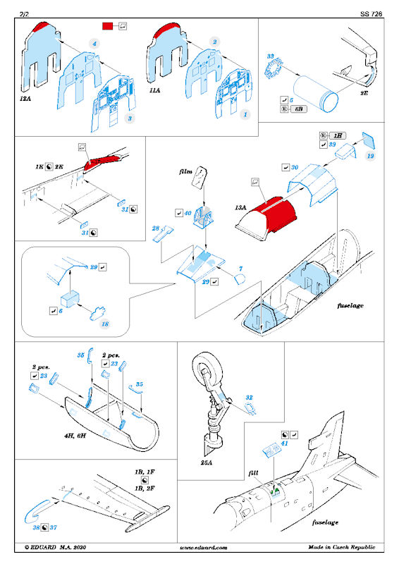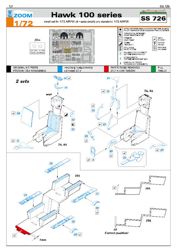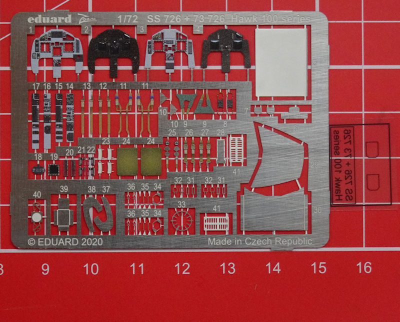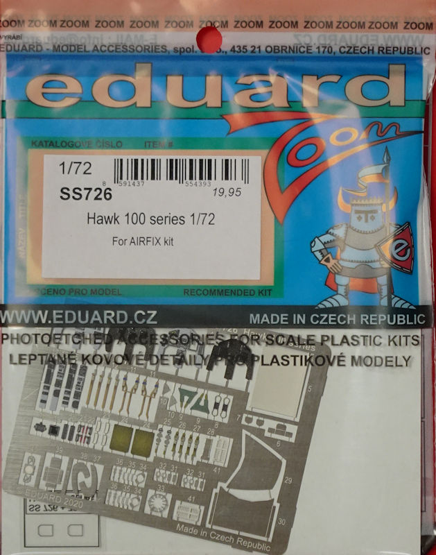 Für die BAe Hawk 100 series von Airfix hat eduard ein ZOOM-Fotoätzteilset herausgebracht. Es enthält eine kleine mehrfarbig bedruckte Platine, einen Fotofilm und die Bauanleitung. Eduard liefert hier wunderschöne Details für das Innere des Bausatzes. So gibt es neue mehrfarbig bedruckte Instrumentenbretter, farbige Geräte, Sitzgurte für den Schleudersitze und paar weitere Kleinteile für Kabine sowie Haube. Weiterhin gibt es noch eine Öse für das Bugfahrwerk, zwei Grenzschichtzäune und eine Abdeckung für den Rumpf.