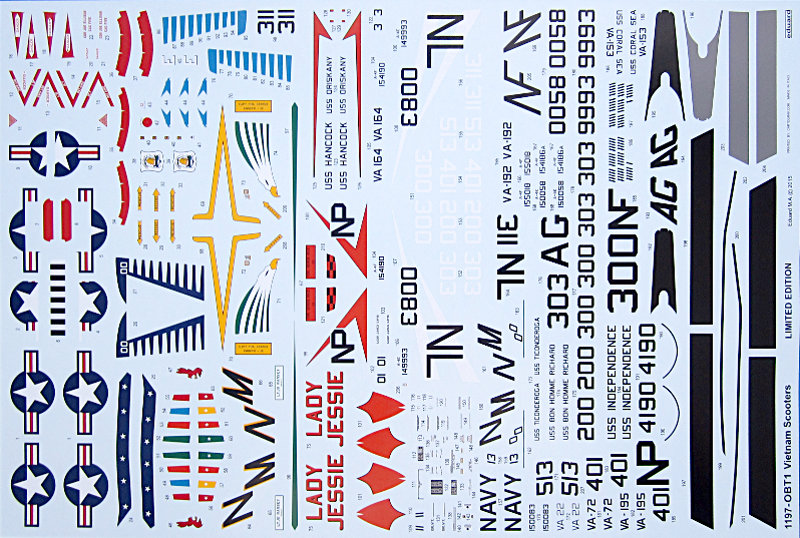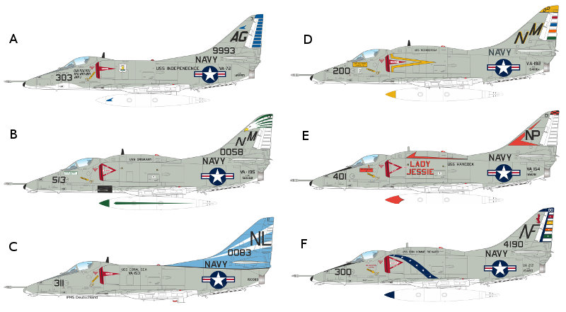 Ebenfalls neu sind die Abziehbilder. Diese wurden von Furball Aero-Design gestaltet und bei Cartograf gedruckt. Der Decal-Bogen ist etwa im Format DIN A4 und enthält auch eine ganze Reihe von Wartungshinweisen. Die Ausführung der Decals ist tadellos! Je 3 A-4E (davon zwei ohne Höcker) und 3 A-4F stehen zur Auswahl: