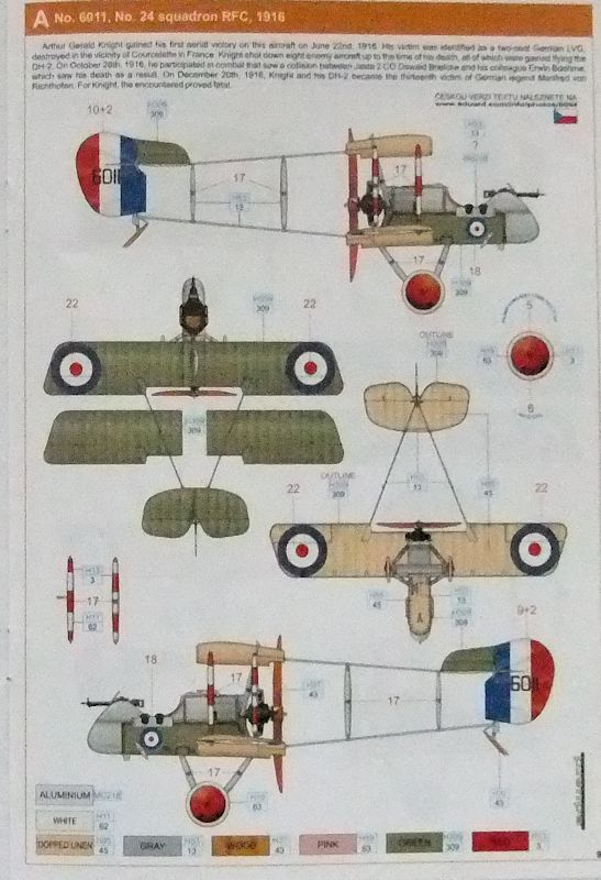 Vorbild: Man kann sich heute kaum noch vorstellen, das es zu Anfang des 20. Jahrhunderts, Männer gab, die sich beherzt in solche abenteuerlichen Luftfahrzeugkonstruktionen setzten, um sich in großer Höhe Duelle mit ihren Gegnern zu liefern, die meistens für den Unterlegenden mit dem Tode endete. Doch zurück zu der DH-2. Der Konstrukteur dieses Jagdflugzeuges war Geoffrey De Havilland. Gebaut wurden die Maschinen allerdings bei der Firma Airco: Aircraft Manufacturing Company. Da auch die Briten zu Anfang des ersten Weltkrieges kein Verfahren zum Unterbrechen der Schussfolge eines Maschinengewehrs durch den Propeller hatten und ein effektives Jagdflugzeug wollten, konstruierte De Havilland eine Maschine mit Druckschraubenantrieb. Da die Propellerblätter Platz brauchten, wurde der Jäger mit einem doppelten Gitterrumpf versehen, an dessen spitzwinkligen Ende dann das Leitwerk montiert wurde.