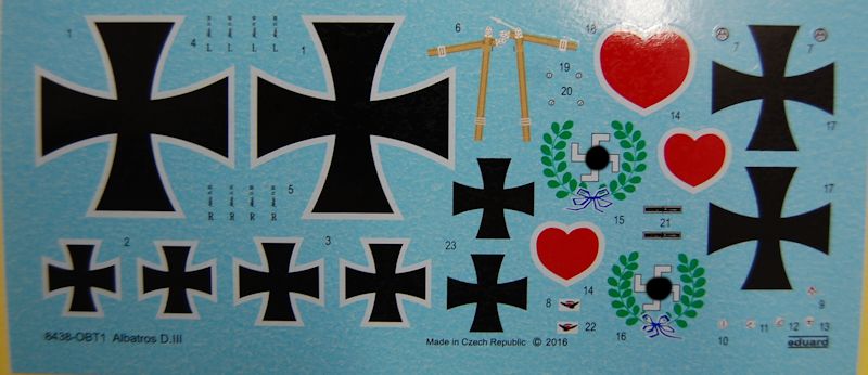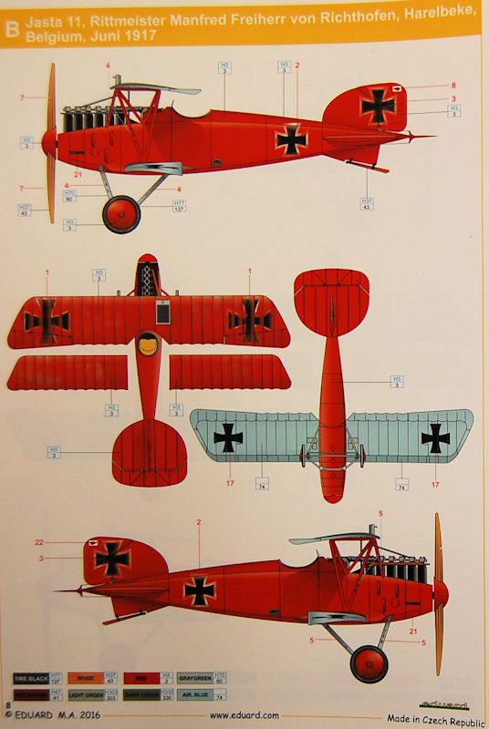 Bemalungsvarianten: Die Decals sind sauber auf blauem Trägerpapier gedruckt. Gebaut werden können die Maschine von Manfred von Richthofen, Jasta 11, und die von Werner Voss, Jasta 2. Das Farbsystem bezieht sich auf Farben von Gunze (für die Metallteile Mr. Metal Color).