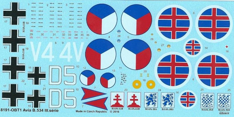 Bemalung: Zu den Highlights zählen wie bei Eduards ProfiPACKs üblich, die vier Decalvarianten. Auf dem Bogen aus eigener Herstellung finden sich Hoheitszeichen, Wartungshinweise, Staffel- und persönliche Abzeichen für drei tschechische und eine slowakische Maschine. Die Bemalungshinweise bestehen wie gewohnt aus farbigen Vierseitenansichten. Die Farbangaben richten sich nach den Farbsystemen von Gunze. Alle Maschinen sind in Khaki über Silber gestrichen, die Propellernaben und Spats haben verschiedene farbige Abzeichen. Die Version D trägt neben den slowakischen Doppelkreuzen auch deutsche Balkenkreuze. Die übrigen Maschinen haben am hinteren Rumpf großflächige und farbenfrohe Verbandsabzeichen.