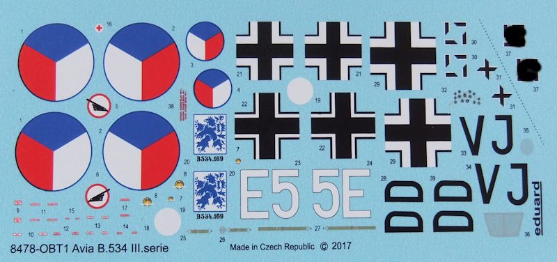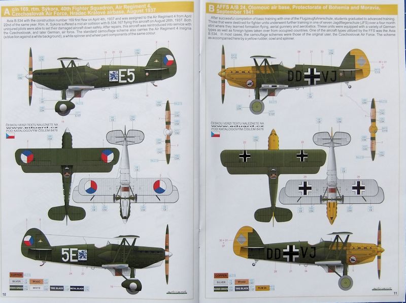 Bemalung: Die Bauanleitung ist ein kleines Heft in Hochglanzdruck mit farbigen Rissen zur Bemalung des Modells. Die sauber gedruckten Abziehbilder erlauben in unserem Falle die Dekoration einer Maschine der tschechischen Luftwaffe von 1937, die in Hradec Kralove stationiert war. Die zweite flog 1942 als Beutemaschine bei der deutschen Luftwaffe im damaligen Protektorat Böhmen und Mähren. Sie diente als Trainingsflugzeug für angehende Jagdpiloten.