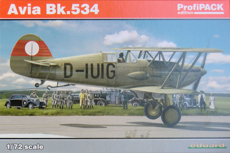 Bausatz: Die Avia Bk.534 im Maßstab 1/72 fehlte noch bei eduard in der Reihe. Nun erschien der länger erwartete ProfiPACK zum Thema. In dem attraktiven Stülpkarton befinden sich gut verpackt drei dunkelgraue Spritzlinge mit 81 Einzelteilen, ein klarer Spritzling mit sieben Teilen, ein kleiner Fotoätzteilbogen, gelbe Masken, einen Decalbogen und die mehrfarbige Bau- und Bemalungsanleitung.