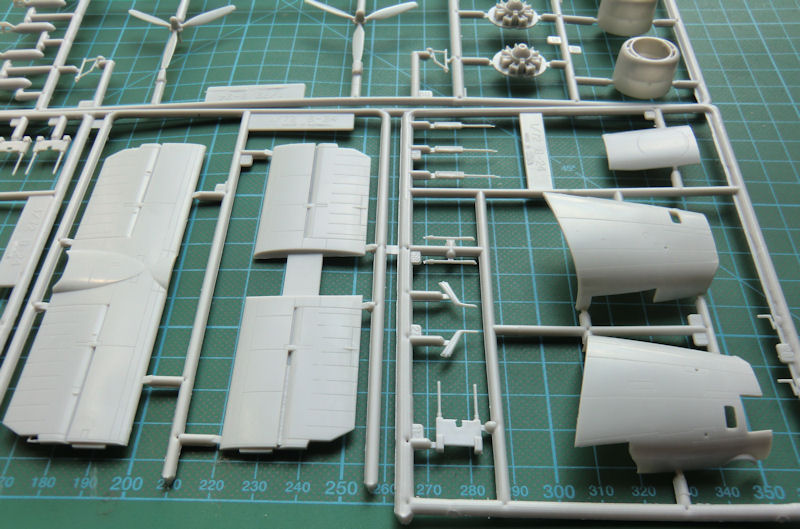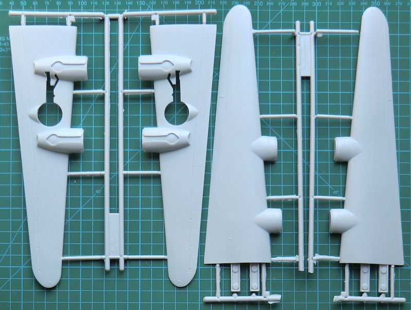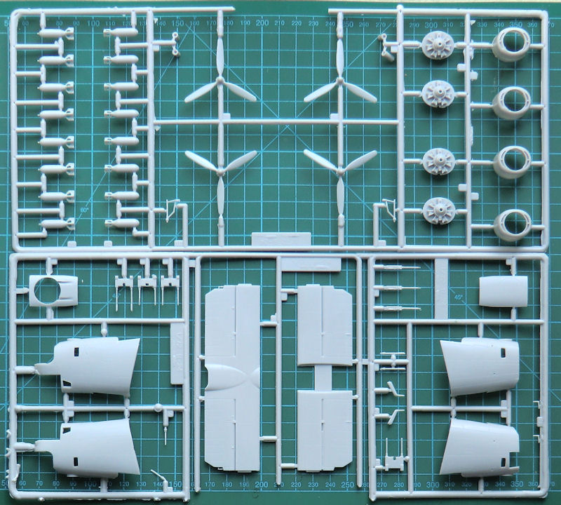Der MINICRAFT-Bausatz stammt noch aus der Zusammenarbeit mit ACADEMY und entstand Anfang der 90er Jahre des vorigen Jahrhunderts. Die Strukturen sind meist fein versenkt. Mit den Kunststoffteilen bekommt man schon eine solide Ausstattung hin. Dank der beiden Fotoätzteilbögen, von denen einer mehrfarbig bedruckt ist, bekommt man eine zeitgemäße Detaillierung gezaubert. Neben den farbigen Instrumentenbrettern gibt es bedruckte Sitzgurte, Armlehnen für die Pilotensitze, Visiere für die Abwehrwaffen und viele Kleinteile für das Innere. Nicht vergessen hat man auch die Munitionsgurte und deren Kisten. Für die Motore gibt es Verkabelungen aus Fotoätzteilen. Auch die Fahrwerksschächte sowie das eigentliche Fahrwerk werden damit weiter detailliert. Der Bombenschacht kann alternativ mit Abwurfwaffen bestückt und geöffnet gebaut werden.
