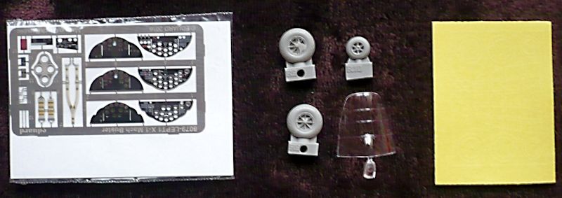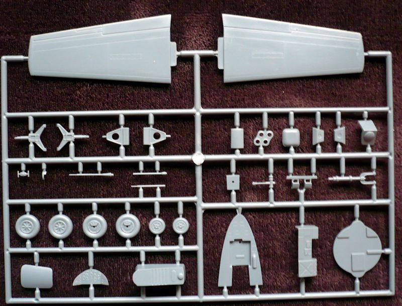 Der Inhalt des Bausatzes teilt sich folgend auf: 2 graue Gussäste mit Rumpf, Tragflächen und Fahrwerk, ein Klarsichtteil für die Kanzelverglasung, einem Decalbogen, einem Bogen Fotoätzteile, Räder in Resin sowie einen Bogen Maskierfolie. Auf der Fotoätzteilplatine findet sich das Gurtzeug des Piloten wieder und interessanter Weise auch 3 verschiedene Armaturenträger die dann der jeweiligen Version zugeordnet werden. Die Resinräder ersetzen die Spritzgussräder.