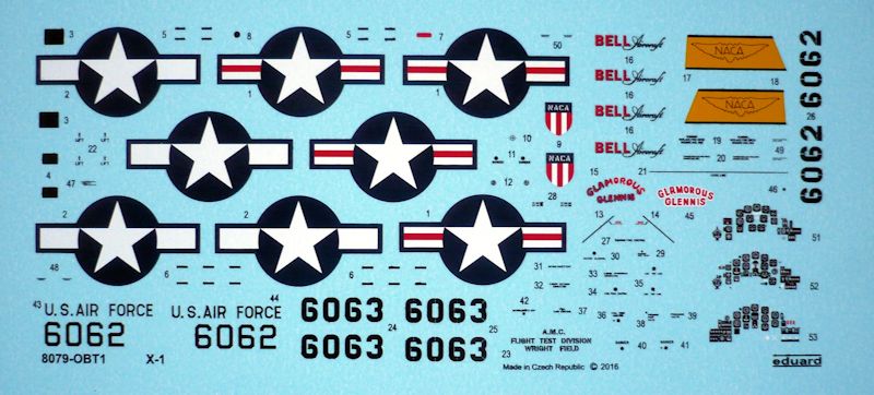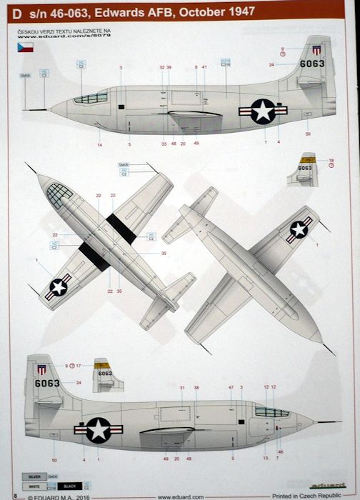 Vorbild : Das von der Firma Bell Corporation in Buffalo gebaute Flugzeug X-1 entstand als gemeinsame Initiative von USAAF, US NAVY und NACA mit dem Ziel, die Schallmauer zu überwinden. Nach einer Menge von theoretischen Besprechungen wurde es als ein einsitziger Ganzmetall-Mitteldecker mit dem Rumpf in einer Projektilform und mit einem Trapezflügel entworfen. Zu den Experimentalflügen wurde die Maschine in einer bestimmten Höhe aus einem Bombenflugzeug Boeing B-29 ausgeklinkt und landete auf klassische Weise. An Bord wurden 450 kg von wissenschaftlichen Apparaturen installiert. Die erste X-1 verließ die Fabrik am 27. Dezember 1945. Den einleitenden antriebslosen Flug absolvierte sie am 25. Januar 1946 über Pinecastle in Florida. Die folgenden Testflüge fanden auf dem Stützpunkt Muroc Dry Lake in der Mojave-Wüste statt, wo die X-1 am 9. Dezember 1946 Kraft des Raketenmotors flog. Nach einer Reihe von Land- und Flugtests durchbrach Capt Charles E. "Chuck" Yeager mit der X-1 am 14. Oktober 1947 zum ersten Mal mit Mach 1,06 (1.126 km/h) im Horizontalflug die Schallmauer. So gingen sowohl das Flugzeug als auch sein Pilot in die Luftfahrtgeschichte ein. Wer das einmal in Bild und Ton anschauen möchte, sollte sich den Film "Der Stoff aus dem die Helden sind - The Right Stuff" von 1983 ansehen.