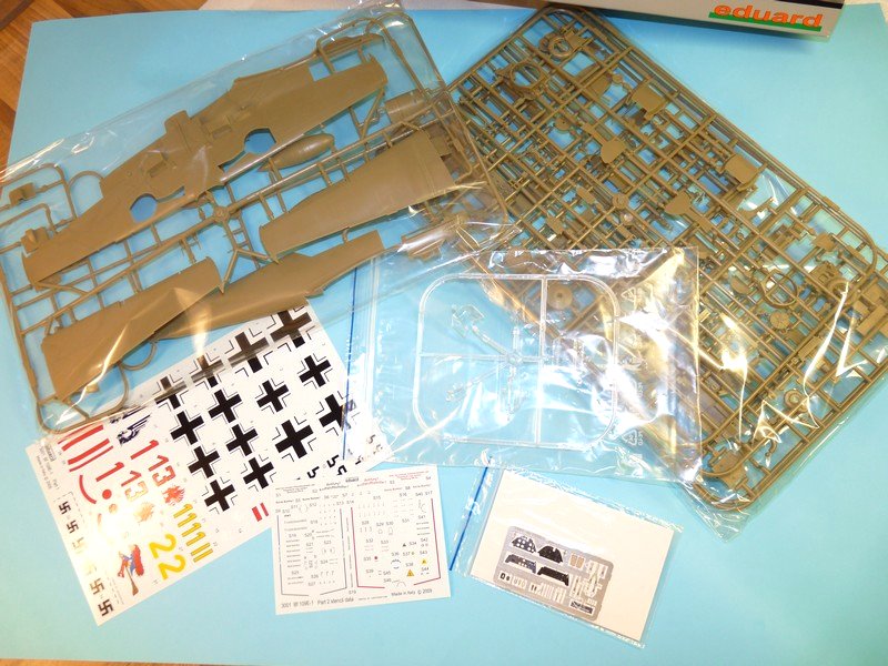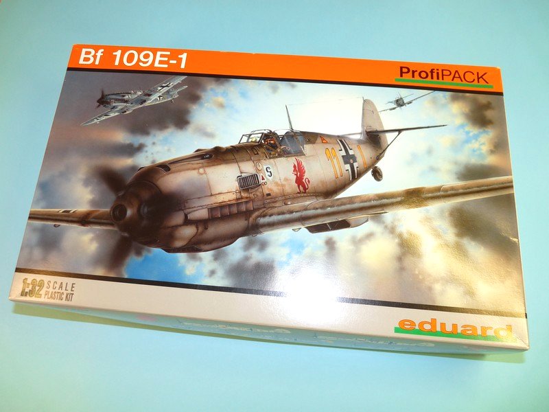 Als erste Variante hat Eduard die Bf 109E-1 herausgebracht. Augenfällige Merkmale zur Unterscheidung innerhalb der E-Serie: MG17 in Rumpf (2) und Tragflächen (je 1), runde Kabinenhaube, kein Zusatz-Tank (erst ab E-7), Daimler-Benz DB601A mit Einspritzung, keine Abwurfwaffen.