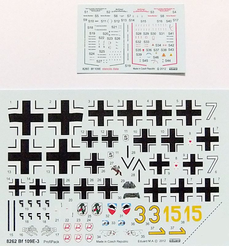 Es liegen ein neu gestalteter umfangreicher Abziehbilderbogen mit Markierungen für fünf unterschiedliche Flugzeuge sowie ein kleinerer Bogen mit generellen Beschriftungen und Warnhinweisen bei: