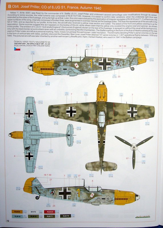 Bauplan/ Bemalung: Als Bauplan erhält man erneut ein farbiges 16 seitiges Heft in DIN A4, das durch den Bauprozess führt. Mittels sehr guter und klarer Abbildungen wird man problemlos durch die Baustufen geführt. Die Angaben zur Bemalung einzelner Teile finden sich in jedem Bauabschnitt sowie für das gesamte Flugzeug auf den vier letzten Seiten. Für die Auswahl der passenden Farben findet man die originalen RLM Bezeichnungen sowie Kodierungen von Humbrol und Gunze.