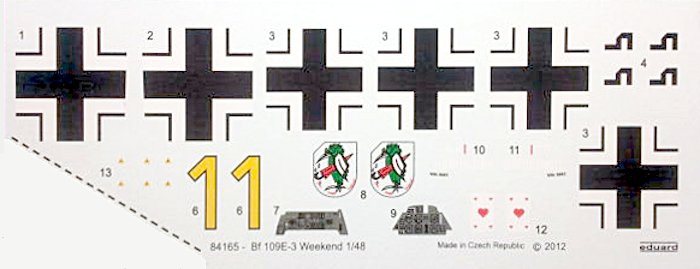Der Decalbogen bietet wie üblich nur eine Version. Diesmal handelt es sich um die "gelbe 1",eine frühe Maschine des Fliegerasses Oberleutnant Josef "Pips" Priller, im Herbst 1940 Staffelkapitän der 6. Staffel JG 51 in Frankreich. Leider fehlen wieder sämtliche Wartungshinweise bis auf das Oktandreieck und das kleine Rote Kreuz für den Verschluss des Rumpfabteils. Eduard bietet hier selbst Abhilfe in Form eines separat zu erstehenden Stencil-Bogens.