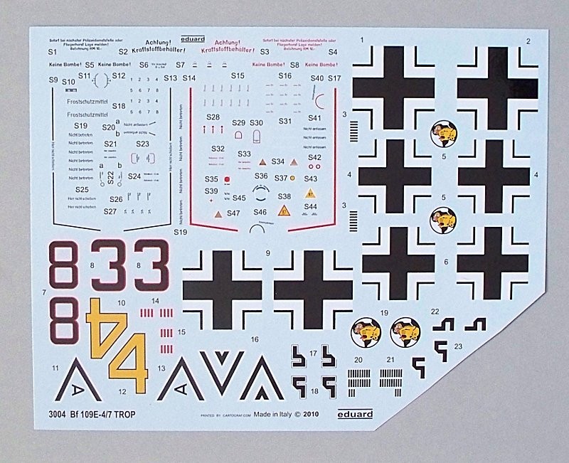 Vor kurzen ist von der tschechischen Firma Eduard ein hervorragendes Modell einer Messerschmitt Bf-109E-7 in Tropenausführung erschienen. Und der Bausatz macht einen klasse Eindruck. Nicht nur die tolle Detaillierung kann überzeugen, sondern auch das die farbig gestalteten Fotoätzteile für eine Superdetaillierung im Innen- und Außenbereich beigefügt sind, ist keine Selbstverständlichkeit, was die Bausatzhersteller betrifft.