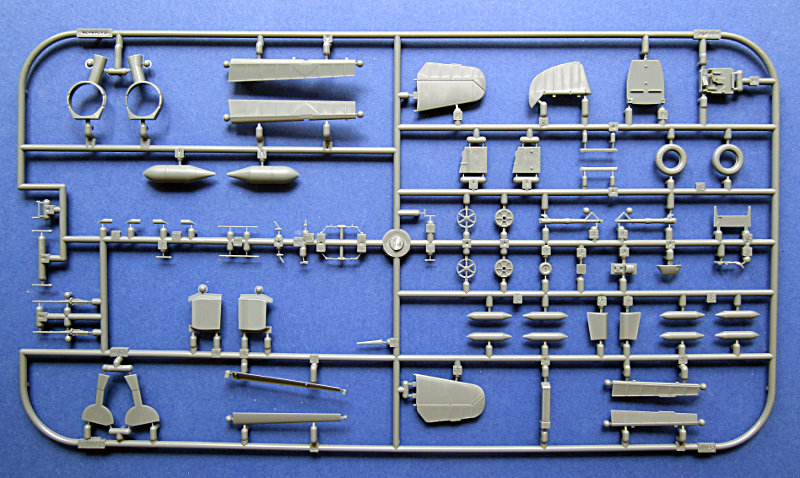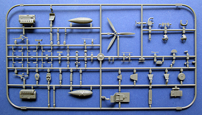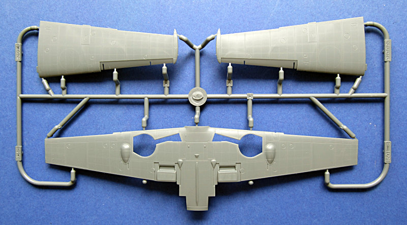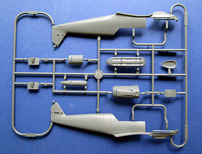 Zum Schachtelinhalt. Hier finden sich 4 graue Spritzlinge und ein klarer Gußrahmen für die Kanzelteile. Immer noch ist die Oberfläche sehr gut gestaltet und für mich das Highlight des Bausatzes. Man sieht aber, dass die Form schon ein paar Lose gelaufen ist (das kann aber auch an einer nicht optimalen Einstellung der Maschine beim Spritzen meines Exemplars gelegen haben). Eduard hat sogar etwas an den Fehlern gearbeitet und die Auftstieghilfen auf der Steuerbordseite auspoliert.