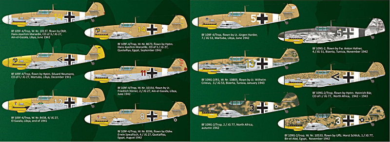 Die Messerschmitt Bf 109 war der Standardjäger der Jagdfliegerverbände in Nordafrika. Fast alle Versionen dieser Zeitperiode kamen dort zum Einsatz, von der E-4 bis zur G-6.