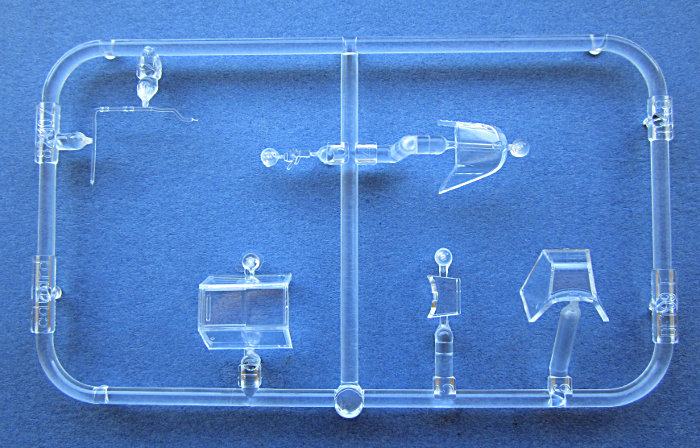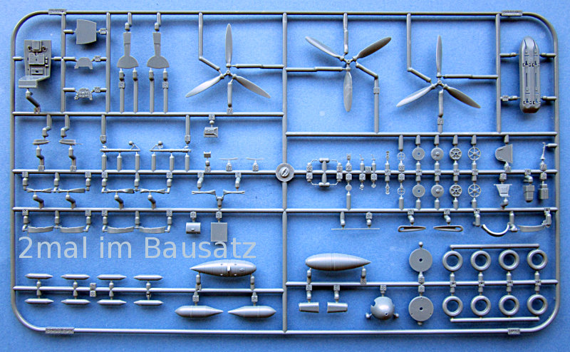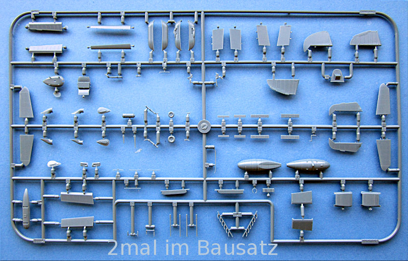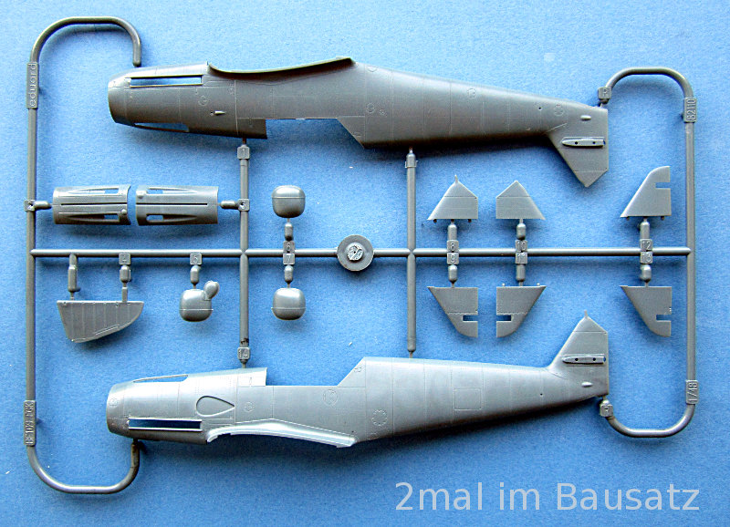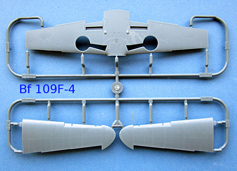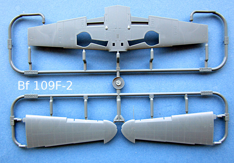 Der Bausatz enthält wie gesagt zwei komplette Modelle: je zwei von den beiden Standardgießrahmen für die Kleinteile, zwei klare Gießrahmen mit den Kabinenhauben, zwei Rumpfspritzlinge für die Bf 109F, einen frühen Flügel mit Lampe und eckigen Radaussparungen, einen späten Flügel mit runden Radausschnitten und Plexiglasverkleidungen für die Positionslichter. Letztere sind nachwievor nicht als Klarteil dabei, sondern müssen durch entsprechende Bemalung nachgebildet oder ausgefräst und mit Klarmaterial gefüllt werden. Auf dem Rumpf sind die Verstärkungsbänder nicht nachgebildet, diese sind je nach Bemalungsvariante aufzukleben (Fotoätzteile).