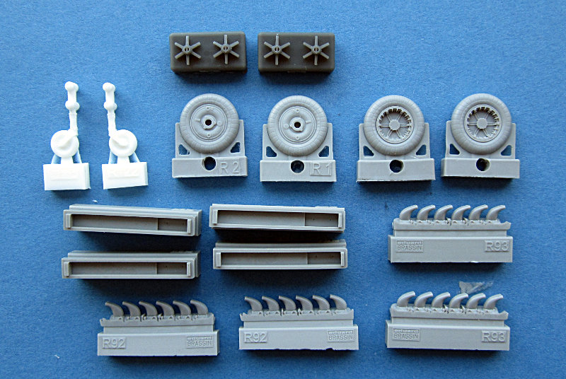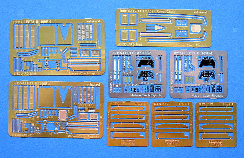 Neben den Plastikteilen finden sich auch die Fotoätzteile der jeweiligen Profipacks (F-2/F-4) im Kasten wieder. Die farbigen Bögen sind identisch, während die unbedruckten sich im Detail unterscheiden. Weiterhin gibt es einen RC-Bogen, der spezifische Teile für einige Bemalungsvarianten enthält. Und schließlich noch drei mal den PE Bogen aus dem Brassin Satz 648 247 Bf 109F Auspuffstutzen. Damit sind wir auch schon bei den Resinteilen. Hier finden wir natürlich auch die Abgasdüsen des genannten Satzes für beide Modelle, sowie zweimal den Satz 648 282 Bf 109F Räder.
