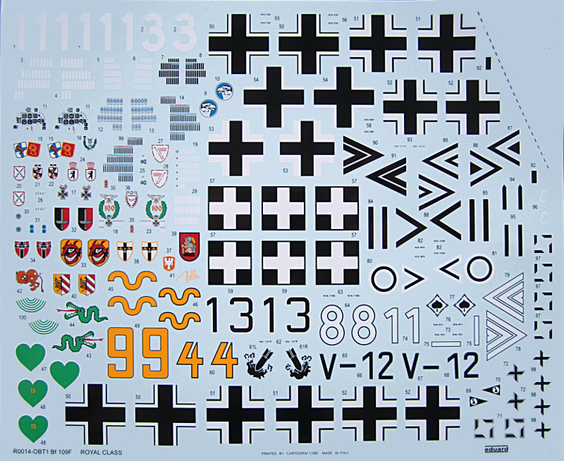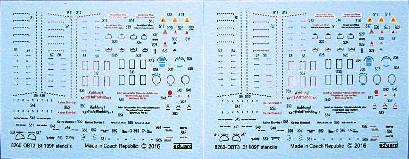 Das Highlight sind natürlich die 14 interessanten und abwechslungsreichen Bemalungsvarianten des Bausatzes. Der Hauptbogen mit den individuellen Markierungen ist wieder einmal von Cartograf gedruckt worden. Auch wenn Eduard inzwischen wirklich gute Decals macht, ist dies ein immer wieder gern gesehenes Merkmal der Sonderbausätze. Die beiden kleineren Bögen mit den Wartungshinweisen steuert Eduard selbst bei.