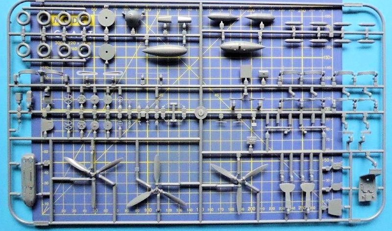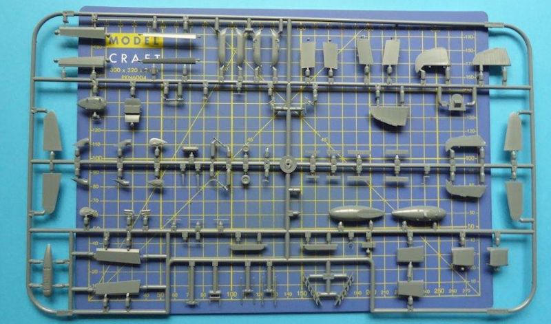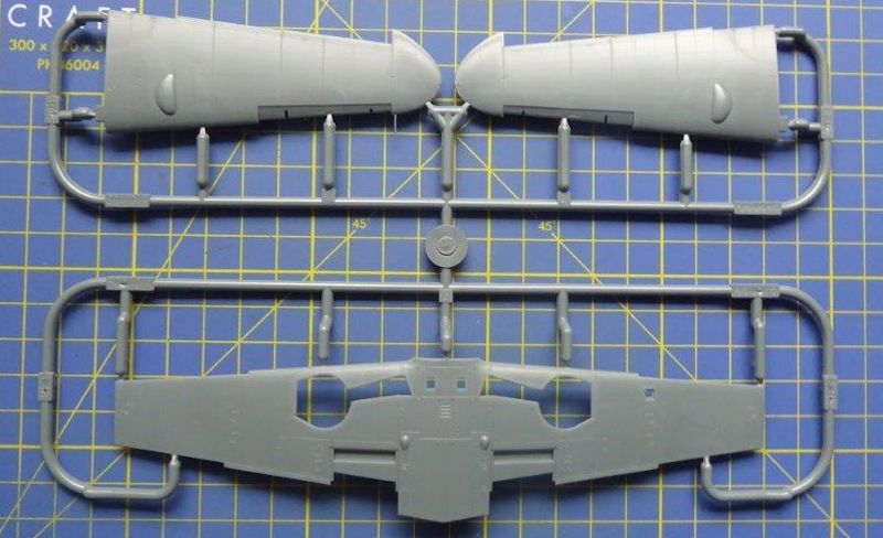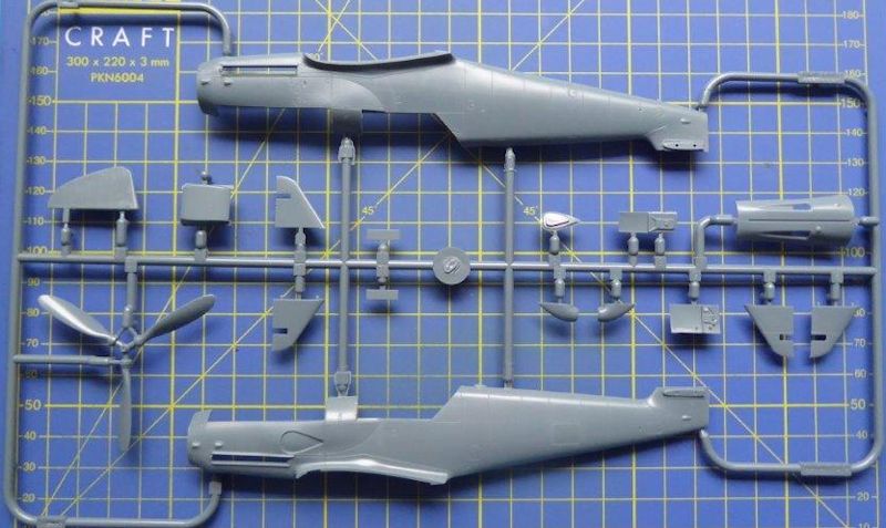 Dem Bausatz liegen vier Graue Spritzlinge bei. Die beiden größten Spritzlinge sind aus den vorigen Bausätzen der 109er schon bekannt. Auch der Spritzling mit den Tragflächen ist mit dem des G-14 Kits identisch. Das angeformte Pitotrohr sollte man lieber vor dem Zusammenbau abtrennen bevor es beim unabsichtlichen Bruch im Nirwana des Teppichs verschwindet.