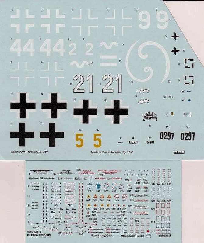 Bemalung: In der Bauanleitung sind Besonderheiten in den Bauabschnitten farblich abgesetzt. Damit wird der Modellbauer gekonnt durch den Bau der G-10 Variante geführt. Die Farbangaben beziehen sich auf GSI Creos (Gunze). Die beiden Abziehbilderbögen sind sehr umfangreich ausgeführt. Der kleinere enthält alle Wartungsmarkierungen. Auf dem größeren ist alles für fünf Varianten der Luftwaffe im Jahr 1944/45.