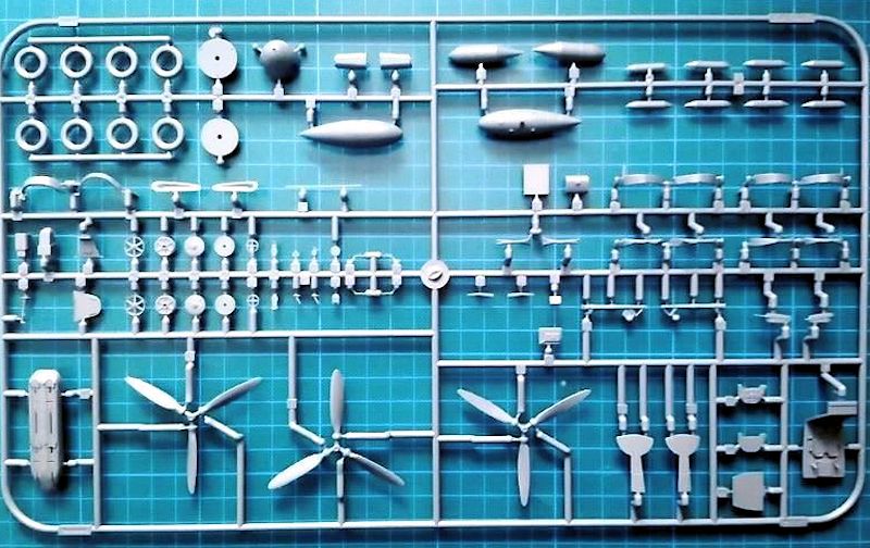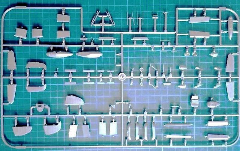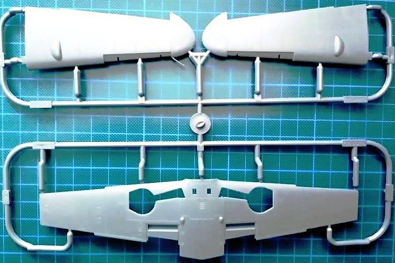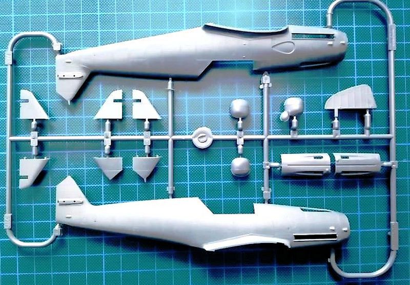 Die Qualität ist wie von den letzten Bausätzen her bekannt makellos, Grat fehlt gänzlich, Auswerfermarkierungen sind an Stellen, wo sie nach dem Bau unsichtbar bleiben. Die Oberfläche zeigt feinste versenkte Gravuren in verschiedenen Stärken und auch die Nieten sind in mehreren Varianten zu finden. Die Glasteile sind dünn und klar. Im Einzelnen ist der Rumpf wie bei diesem Hersteller üblich einteilig. Alle Steuerflächen, die Vorflügel und die Klappen der Flügelkühler sind separat nachgebildet.