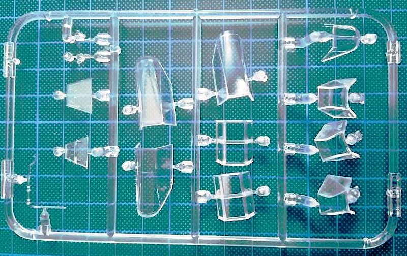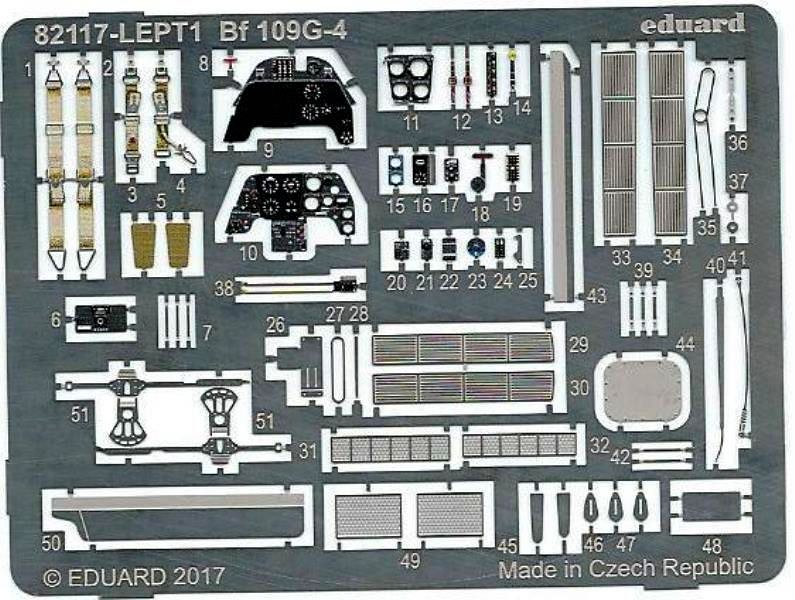 Die Gießrahmen für den Rumpf und die Flügel sind variantenspezifisch, alles Übrige ist mit "Bf 109 F G K" markiert. Es gibt drei verschiedene Propeller, zwei verschiedene Ladereinläufe, einen Tropenfilter, je ein Spornrad mit kurzem und langem Bein, Seitenleitwerke und -ruder niedrig und hoch, flacher und tiefer Ölkühler, Räder schmal und breit, mit Speichenfelge und Stahlfelge sowie mit und ohne Profil, eine Cockpit-Rückwand mit Batteriekasten, einen kurzen und einen langen Antennenmast, Kopfpanzer aus Stahl und zwei Versionen aus Panzerglas, Gondelbewaffnung mit MG 131/20mm für Rüstsatz 6, eine 250 kg-Bombe mit Träger, Rumpfbombenträger mit 50 kg-Bomben (Rüstsatz 2), zwei verschiedene Zusatztanks mit Trägern, zwei Abdeckbleche mit verschiedenen Durchbrüchen für die Rumpfwaffen als Teile der Motorhaube oder mit separaten Gravuren. Windschutzscheiben ohne, einer bzw. mit zwei und der Leuchtpistolen-Öffnung, eine dreiteilige und drei verschiedene Erla-Hauben. Somit hat man alles, um frühe und späte Versionen der 109G zu verwirklichen.