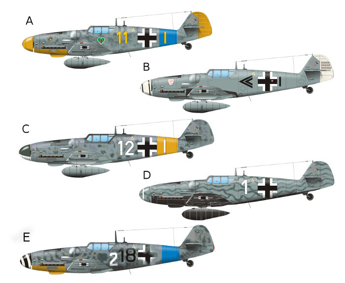 Vorbild: Die Bf 109 G-5 entsprach im Wesentlichen der Bf 109G-6, abgesehen von der hier installierten Druckkabine. Mit Einführung der MG 131 statt der MG 17 gab es links oben am Motorblock keinen Raum mehr für den Druckkompressor, welcher daher seinen Platz auf der rechten Motorseite fand und für die kleine Beule unterhalb der MG-Beule verantwortlich war. Gleich über der kleinen Beule befand sich der Lufteinlauf für den Kompressor. Die Beule für den Kompressor findet sich an Bf 109 verschiedener Varianten, obwohl dort überflüssig. Meistens fehlt dann aber der Lufteinlauf.