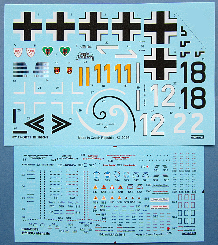 Eduard hat sich hier für vergleichsweise "bunte" Maschinen entschieden, die dem Einsatzspektrum als Höhenjäger entsprechen. Die Decals sind bei Eduard gedruckt. Sowohl die Markierungen für die verschiedenen Vorbilder als auch die Wartungshinweise sind sauber gedruckt und versatzfrei.