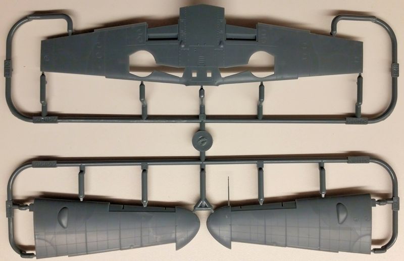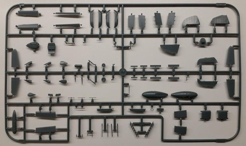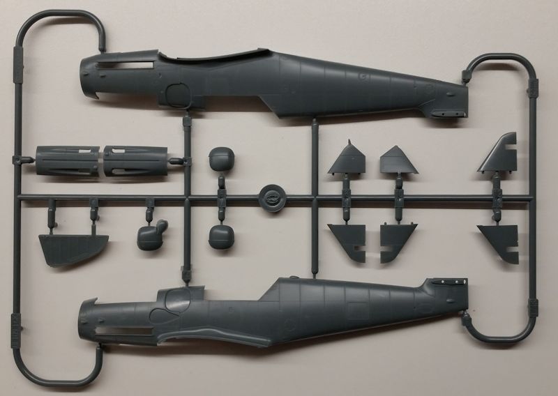 Die vier grauen Spritzlinge des Bausatzes sind identisch mit denjenigen des Profipacks. Insofern muss über die hervorragende Qualität kein Wort mehr verloren werden. Die sauber gespritzten Klarsichtteile sind separat verpackt. Besonders gut gefällt mir persönlich die Möglichkeit, dass sämtliche Steuerflächen und auch die Vorflügel als separate Teile beiliegen. Die Bf 109 setzt sich aus ca. 100 Teilen zusammen.