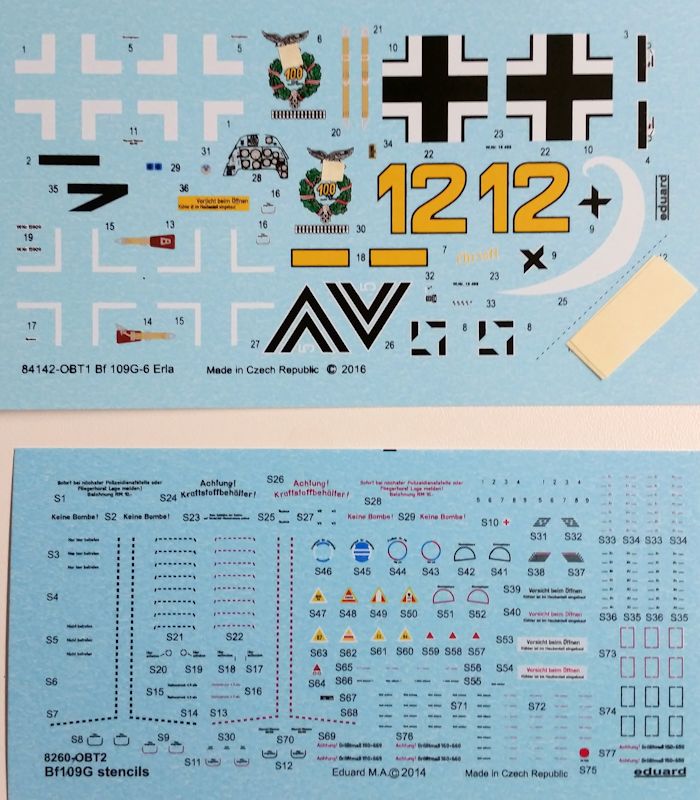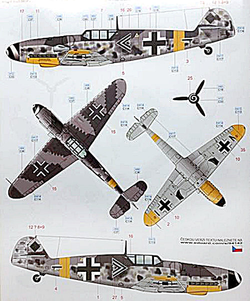 Bemalung: Eduard hat sich zwei Maschinen von prominenten Piloten der Luftwaffe zum Vorbild genommen. Dies ist erstens die Gelbe 12 von Hauptmann Heinrich Ehrler, die im Juni 1943 beim Stab III. / JG 5 über Finnland zum Einsatz kam. Zweitens ist es die Werk-Nr. 15909 von Hauptmann Gerhard Barkhorn, welche im September 1943 in Russland beim Stab II. / JG 52 flog.