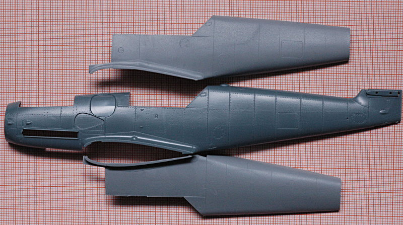 Die Rumpfsektionen 2 (hinter dem Cockpit) bis 7 (vor dem Seitenleitwerk) haben jeweils einen Längenabstand von 453 mm, das macht zusammen 2714mm, in 1:48 müsste ein korrektes Modell 56,625 mm lang sein. Der Eduard Kit ist alleine in diesem beschränkten Bereich 58, 2 mm lang was im 2793,6 mm eines Originals entspräche. Der Zvezda Bf 109 Bausatz trifft die Maße zu 100%.