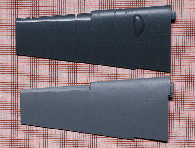 Die Seitenflosse hat fälschlicherweise im Modell ein symmetrisches Profil. Im Original ist die linke Seite gewölbt, die rechte Seite flach.