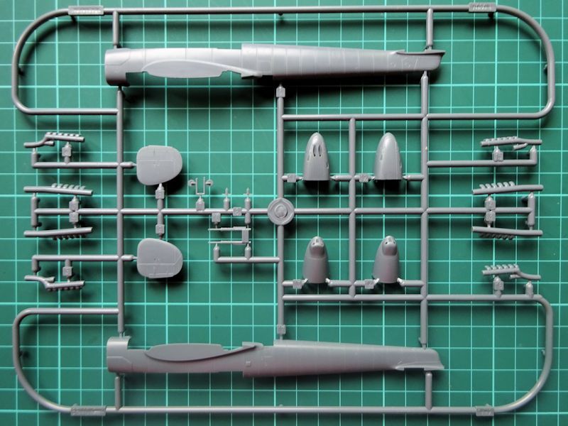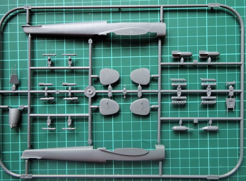 Bausatz: Die Neuauflage der Bf 110 G-4 als ProfiPack ist eine geringfügige Erweiterung der Erstausgabe. Im randvoll gefüllten Karton befinden sich acht gut verpackte graue Spritzlinge mit ca. 170 Teilen, ein Klarsichtrahmen, Ätzteile, Masken und die Abziehbilder. Mit anderen Worten: es bleiben etliche Teile für die Restekiste übrig. In allen Bereichen, egal ob Oberfläche, Räder, Antennen, Fahrwerk etc., ist die Detaillierung super und eine intelligente Konstruktion sorgt für eine perfekte Passform. Überzeugende Gravuren kennzeichnen das Modell.