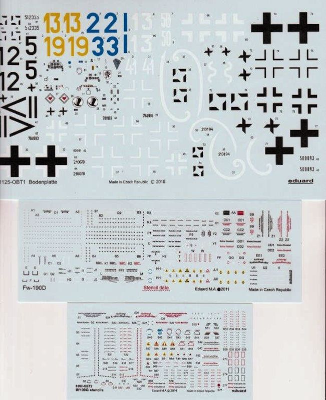 Bauanleitung/ Bemalung: Eine sehr gut gestaltende Bauanleitung umfasst 32 Seiten und sollte beim Zusammenbau sehr von Hilfe sein. Etwas Erfahrung im Modellbau sollte man schon haben, sind diese Modelle doch etwas komplex. Eduard bezieht sich bei den Farben auf das Gunze Farbprogramm. Der umfangreiche und große Decalbogen ist von Eduard wieder sehr sauber und versatzfrei gedruckt. Mit ihm lassen sich jeweils vier Fw 190 D-9 bzw. vier Bf109 G-14/G14AS markieren. Zwei kleinere Bögen umfassen die jeweiligen Wartungs- und Warnhinweise.