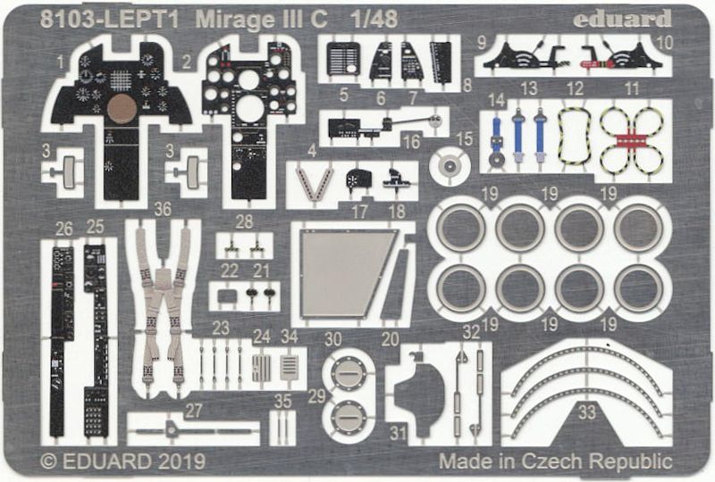 Zusammen mit den farbigen Fotoätzteilen und den beiliegenden Gurten kann ein sehr detailliertes Cockpit gebaut werden. Man kann aber auch die beigefügten Abziehbilder benutzen.