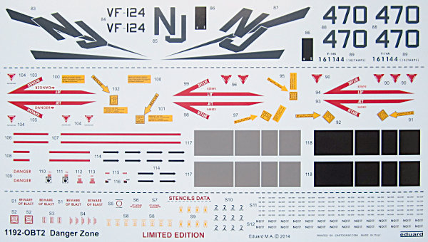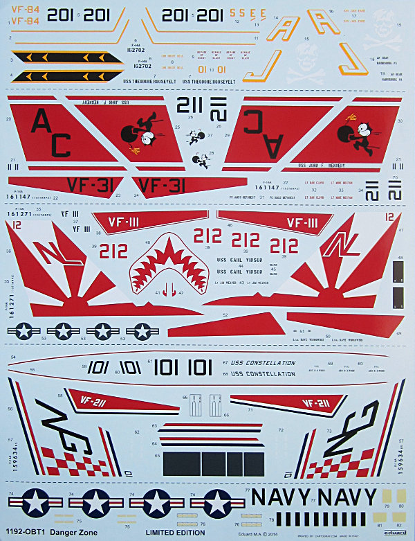 Die Decals sind natürlich ein Highlight des Bausatzes. Fünf farbenfrohe Tomcats können mit Hilfe der Abziehbilder entstehen. Die Decals sind wieder bei Cartograf gedruckt und von sehr guter Qualität. Der Bausatz enthält zwei Decalbögen, einer ist etwa A4 und der andere ein Drittel so groß.