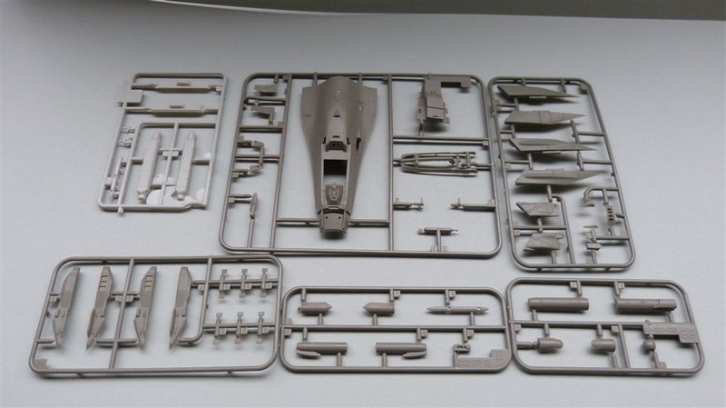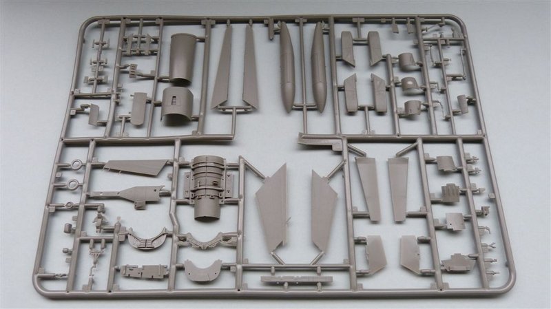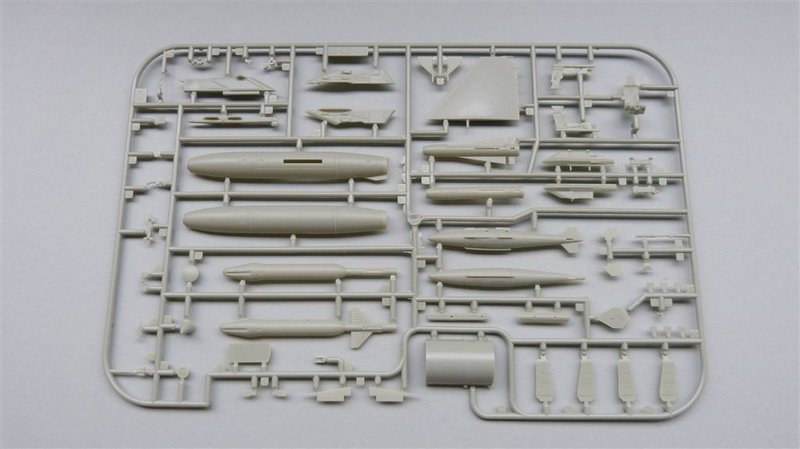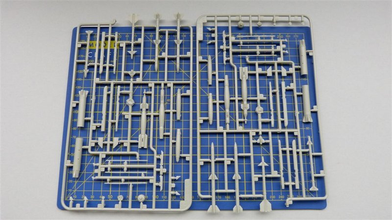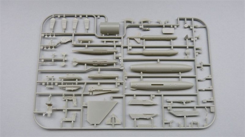 Die Spritzlinge, sind in verschiedenen Grautönen aus der Gussform gekommen. In dem Karton befindet sich erfreulicher Weise ein reichhaltiger Satz moderner Waffen wie Sidewinder AIM-9M und.X, AIM-120B, lasergelenkte Bomben, JDAMS (Joint Direkt Attack Munition) und eine Vielzahl von Aufklärungs- und Zielbeleuchtungspods wie den Sniper XR. Viele dieser Waffen, werden für das Modell nicht gebraucht, und können in die Grabbelkiste für ein neues Projekt wandern.