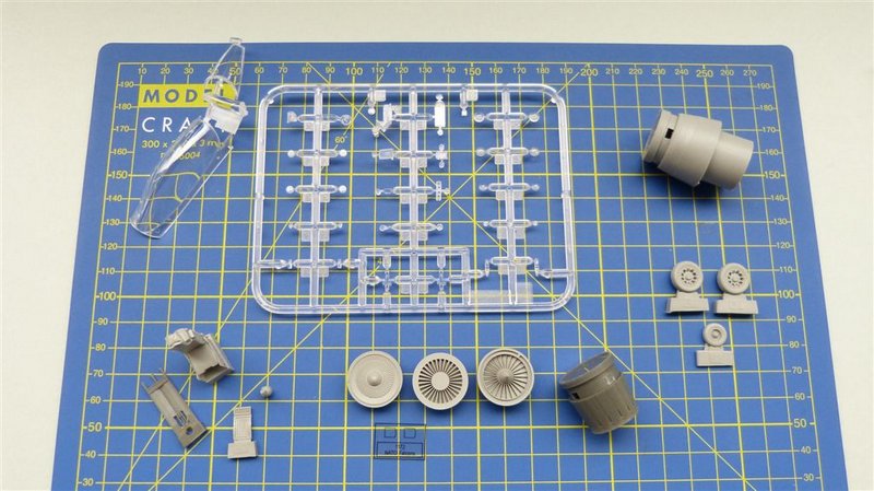 Ein besonderes Highlight sind die Zusatzteile der Firma Brassin (Eduard). Der Triebwerkbereich des Pratt & Whitney F-101 Turbofan ist perfekt wiedergegeben. Alle Fanschaufeln die dem Bausatz beiliegen können durch Brassinteile ersetzt werden. Ein hervorragender Schleudersitz, perfekte frühe Bereifung aus Resin runden den sehr guten Eindruck dieses Bausatzes ab. Ein Maskensatz zum Abkleben der Cockpithaube und des Fahrwerkes darf auch nicht fehlen.