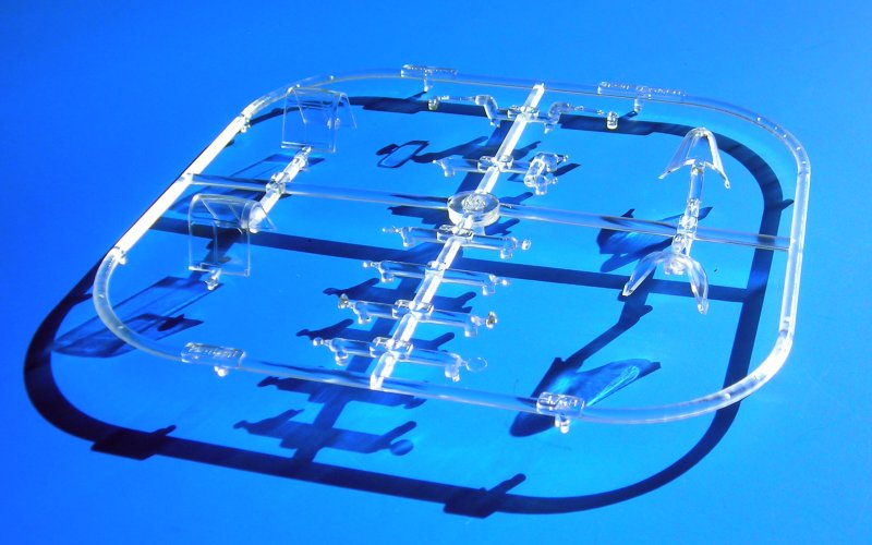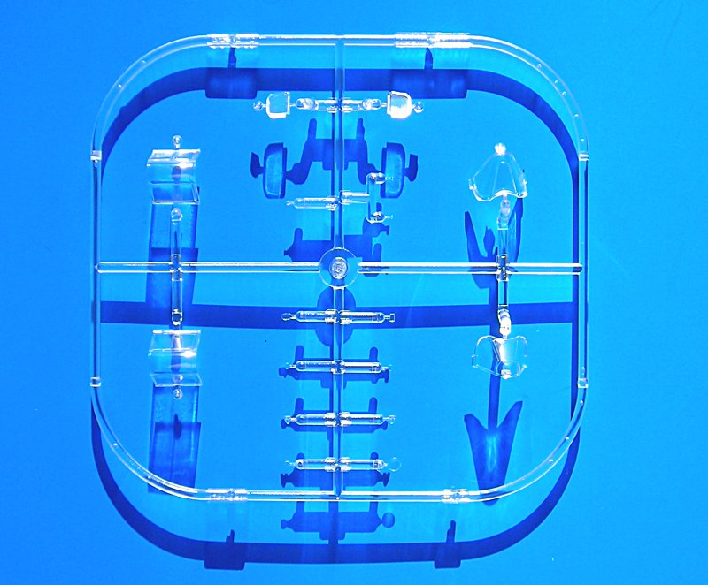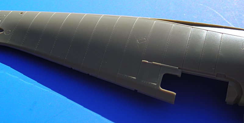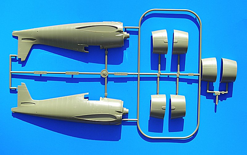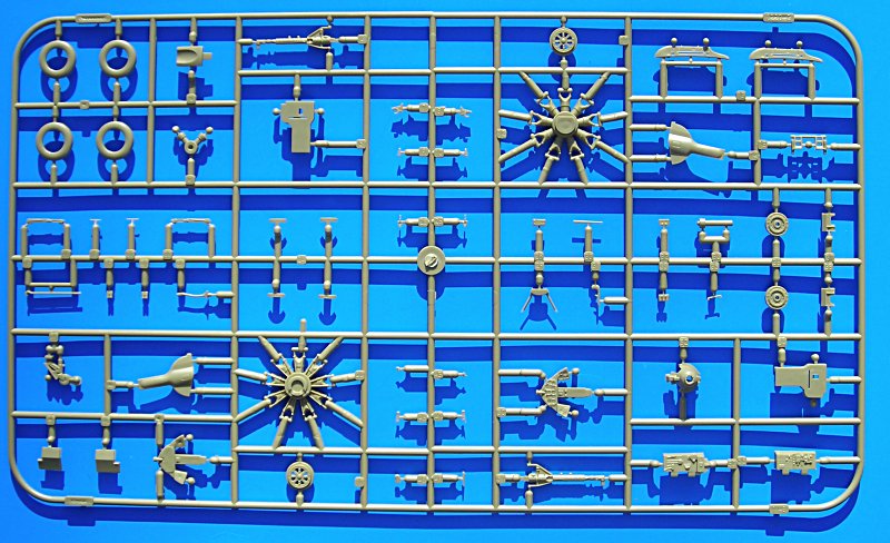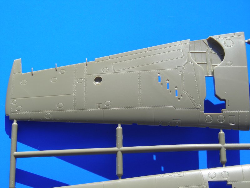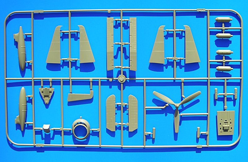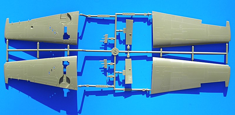 Auf vier Spritzlingen im bekannten beigefarbenen Plastik findet sich alles zum Bau des Modells, abgesehen von den Klar- und Ätzteilen. Die Abspritzung ist wie immer sauber und nur mit minimalem Grat an den Formtrennstellen. Besonders gefällt mir die angedeutete Überlappung der Bleche am Rumpf ... hier ist es den Modellbauern nur schwer recht zu machen: einige wollen die erhabenen Überlappungen und andere versenkte Gravuren. Eduard bietet beides samt Nietenreihen und liefert damit das Optimum aus Vorbildtreue, Modellbauerwünschen, Preisgestaltung und formtechnischen Begrenzungen.