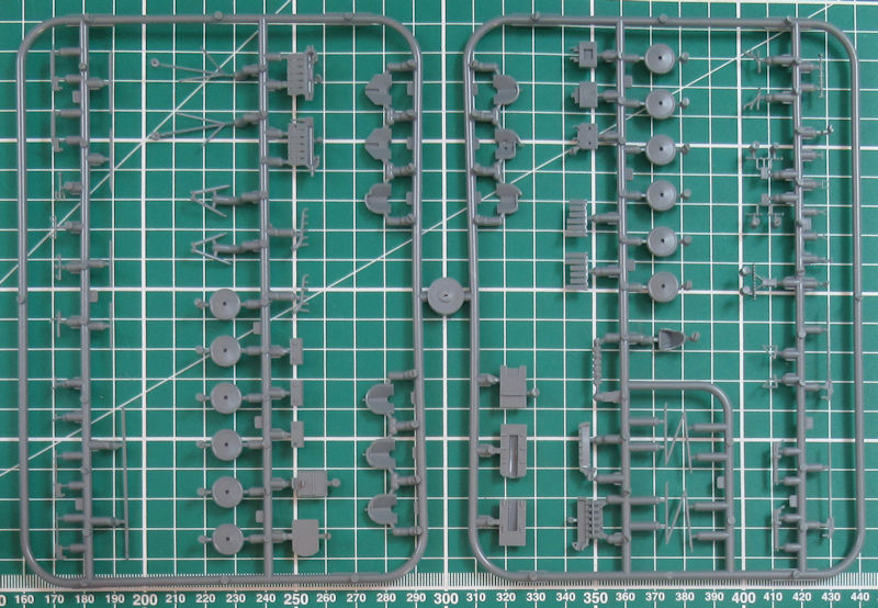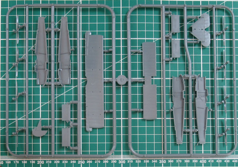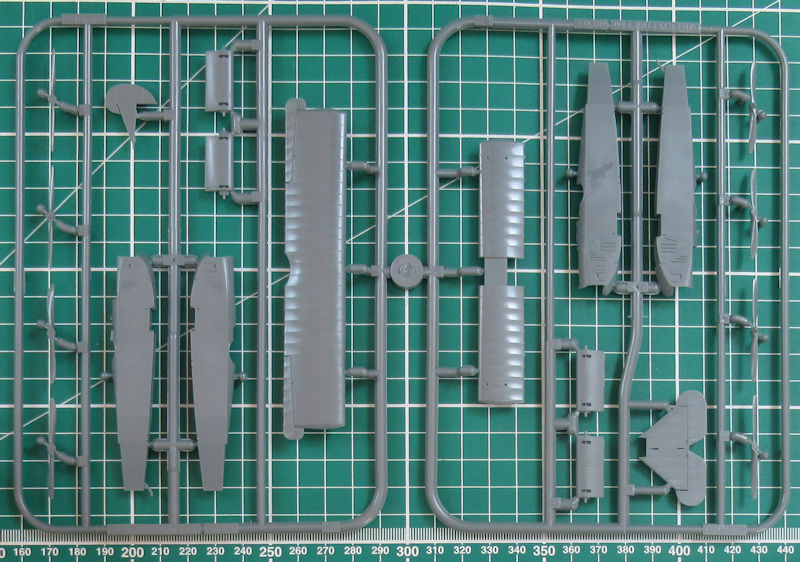 Der Motor entsteht aus fünf Teilen. Die beiden MGs sehen schon sehr gut aus. Allerdings müssen für die Kühlmäntel Fotoätzteile verbaut werden. Tragflächen und alle Ruder haben scharfe Hinterkanten. Am Unterrumpf wird die Naht separat eingeklebt. Beim weiteren Zusammenbau muss man sich für eine der zahlreichen Optionen entscheiden. So gibt es für die OAW zwei verschiedene Radsätze und Propeller.